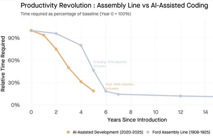 “Ford took six years to achieve 90% time reduction. AI coding tools reached 81% in five. The slopes are nearly identical.”